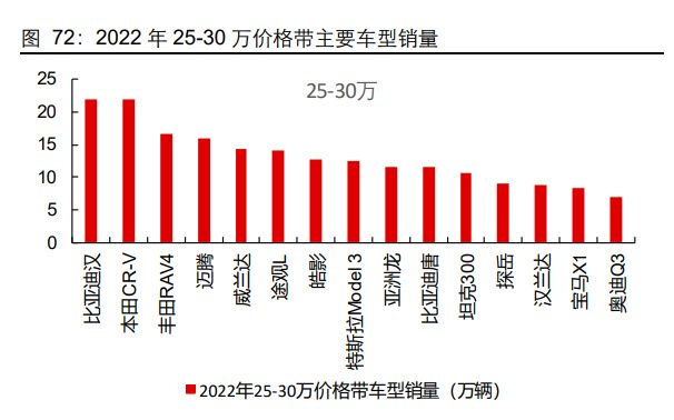 分车型来看,特斯拉在各细分市场产品竞争力强劲,降价后竞争优势明显。 Model 3:调价后从 25-30 万价格带下降至 20-25 万价格带,燃油车销量受影响明显。 2022 年 20-25 万价格带来看,前十名车型包括卡罗拉、凯美瑞、雅阁、比亚迪汉、本 天 CR-V、帕萨特、丰田 RAV4、迈腾、天籁、威兰达。20-25 万价格带热门车型以日系 燃油车为主,只有比亚迪汉为新能源车型。价格带整体来看,2023Q1 在 20-25 万价格 带销量 78.9 万辆,同比下滑 14.1%。其中,Model3、比亚迪汉等新能源车销量提升较 快,分别同比增长 25.2%、19.2%。燃油车销量下滑明显,卡罗拉、凯美瑞、帕萨特等 车型销量快速下滑。Model3 在 20-25 万价格带竞争优势明显。