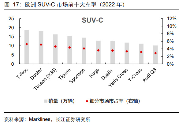 从代表性车型来看,欧洲热销的 SUV-C 为大众探歌(T-Roc)、达契亚 Duster,2022 年 销量分别为 18.6 万/ 17.0 万辆;销量最高的 B 级别车为标致 208,2022 年销量为 21.8 万辆;销量最高的 C 级别车为大众高尔夫,2022 年销量为 18.1 万辆。