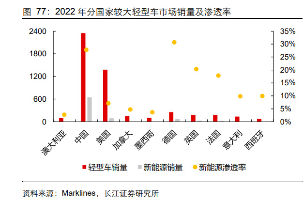 3)成熟市场:新能源渗透率高,超过 50%。包括瑞典与挪威,两者均具备一定市场规 模,2022 年轻型车销量分别为 32.3 万/ 20.4 万辆,新能源渗透率明显高于欧洲其他国 家,分别为 50.2% / 75.8%。