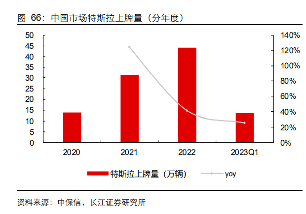 中国市场特斯拉需求和出口销量稳步上行。拆分来看,2022 年特斯拉中国市场上牌量 为 44.2 万辆,同比增长 41.7%。出口销量 27.1 万辆。2023 年 Q1 2上牌销量 13.7 万辆, 同比增长 26%,出口销量 9.2 万辆,同比增长 24%。