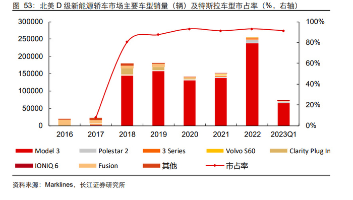 Model 3 车型撑起北美 D 级新能源轿车市场发展,尚无其他具备竞争力车型。2017 年 在北美交付后 Model 3 快速增长,推动 D 级新能源市场快速增长,2020-2023Q1 市占 率均保持在 90%以上。2022 年 Model 3 销量 23.8 万辆,同比增长 71.9%,D 级新能源 轿车市场市占率达 93.1%,同比提升 1.8pct。而近年该市场除 Model 3 以外车型合计销 量仅在 1-4 万辆区间波动,一直未出现具有竞争力车型。