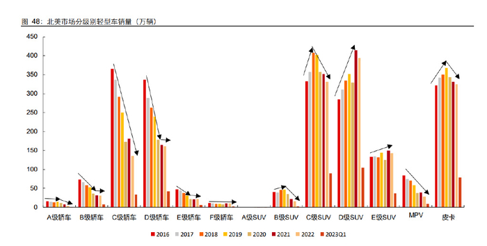 聚焦新能源来看,D 级 SUV、D 级&E 级轿车市场新能源渗透率均领先于行业整体水平, MPV 及皮卡市场新能源供给较少。 1)轿车:新能源渗透率领先行业,2022 年销量 37 万辆,同比增长 40.7%,新能源渗 透率达 10.3%,同比提升 3.9pct。其中,A 级&B 级销量小且渗透率低于行业,D 级&E 级轿车市场新能源渗透率均领先行业。D 级市场 2022 年销量 25.6 万辆,同比增长 68.5%, 新能源渗透率达 15.9%,同比提升 6.6pct,2023Q1 销量 7.2 万辆,同比增长 25.4%, 新能源渗透率达 17.3%,相较 2022 年水平提升 1.5pct。E 级市场 2022 年销量 6.5 万 辆,同比增长 87.0%,新能源渗透率达 29.7%,同比提升 13.2pct。2023Q1 销量 1.6 万 辆,同比增长 16.8%,新能源渗透率达 28.0%,相较 2022 年水平下降 1.7pct。 2)SUV:新能源渗透率略微领先行业,2022 年销量 64 万辆,同比增长 47.6%,新能 源渗透率达 7.2%,同比提升 2.6pct。其中,A 级&B 级市场销量几乎尚无新能源车型。 D 级市场 2022 年销量 41.5 万辆,同比增长 41.5%,新能源渗透率达 10.5%,同比提升 3.4pct,2023Q1 销量 14.1 万辆,同比增长 35.1%,新能源渗透率达 13.5%,相较 2022 年水平提升 3.0pct。E 级市场 2022 年销量 7.8 万辆,同比增长 33.6%,新能源渗透率 达 5.5%,同比提升 1.6pct,2023Q1 销量 2.6 万辆,同比增长 90.9%,新能源渗透率达 7.0%,相较 2022 年水平提升 1.6pct。 3)MPV:据 Marklines 分车型数据,克莱斯勒 PACIFICA 为当前市场唯一新能源车型, 2022 年销量 1.5 万辆,新能源渗透率达 5.1%。 4)皮卡:2021 年福特 F 系、GMC 悍马 EV 皮卡、Rivian R1T 上市开启皮卡新能源市 场,2022 年销量 3.0 万辆,新能源渗透率达 1.8%。