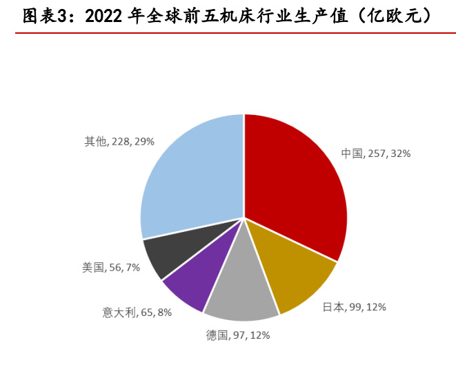 在生产端以及消费端,中国机床均为全球最大参与者。根据 VDM 德国机械工 业网公布的 2022 年全球市场报告,2022 年全球机床行业总产值约 803 亿欧元, 中国以 257 亿欧元的产值位居全球第一,在全球市场中占据 32%的份额,其次是 日本和德国,产值分别为 99 亿欧元和 97 亿欧元,占全球市场的比例为 12%、12%。 全球机床行业 CR5 高达 71%,反映出全球机床制造市场集中度较高。2022 年 全 球机床行业消费额为 808 亿欧元,中国同样以 260 亿欧元的规模稳居市场第一, 其次是美国、德国,消费额分别为 97 亿欧元、52 亿欧元,在全球需求市场中所 占份额分别为 12%、7%,前三个国家的需求已经占据了全球机床消费的半壁江山。 近五年,中国始终维持着全球机床市场供需两端的龙头地位,2022 年仍保持着产 值同比增长 18%、消费同比增长 10%的高速成长,叠加制造业实体经济从今年开 始不断复苏,原本因经济环境停滞的部分需求也开始得到释放,未来市场将有更 大成长空间。