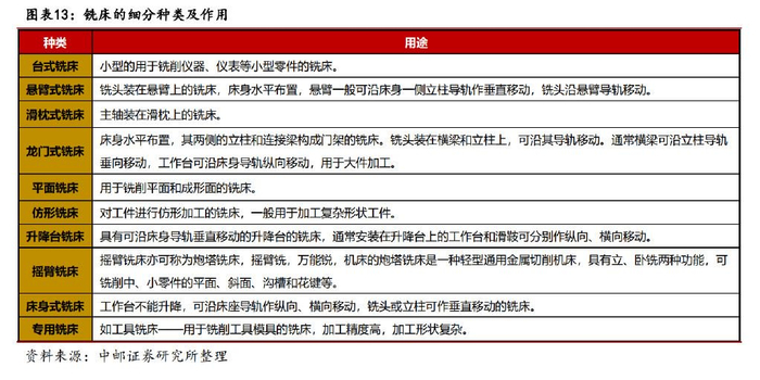 铣床是一种用铣刀在工件上加工多种表面的机床。铣床与车床明显的区别是 铣床的刀具进行高速旋转,而工件基本不动,而且多数铣床都是立式的,主要用 于切削工件平面。铣床在加工时,工件装在工作台上或分度头等附件上,铣刀高 速旋转并根据加工需求在工件表面移动而铣削加工。由于是多刀断续切削,因而 铣床的生产率较高。1950 年后数控系统开始用于铣床,1970 年以后铣床在数控 系统和自动换刀技术的加持下,铣床的应用范围、加工精度和效率都得到了提升。 根据铣床的结构,可以分为龙门式铣床、台式铣床、悬臂式铣床、平面铣床、 仿形铣床、摇臂式铣床等。铣床还可以分为立式铣床和卧式铣床,卧式铣床在精 度和功能拓展性上更好,正在受到用户的青睐。但是立式铣床的稳定性、价格等 有一定优势,因此在钻孔和插削工艺领域应用比较广泛。