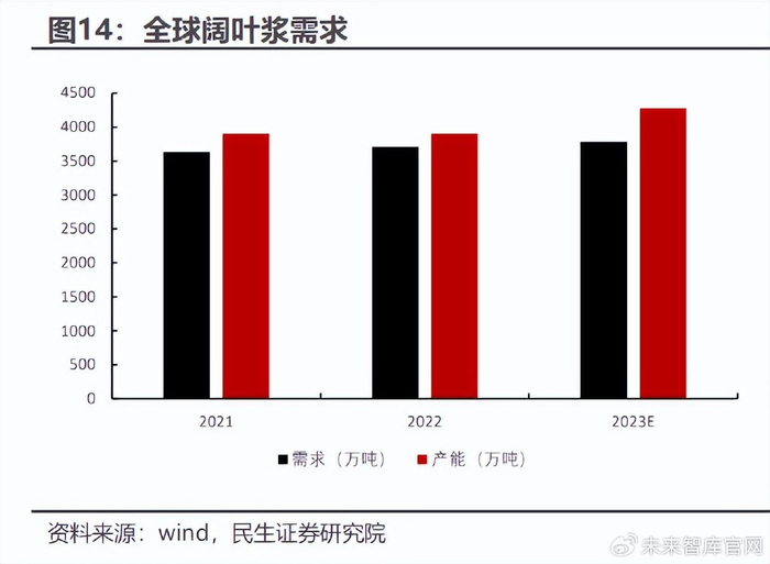 木浆产能脉冲式投放,浆价或持续处于筑底状态。2021-2023 年全球商品阔 叶 浆 产 能 分 别 为 3903.5/3903.5/4279.5 万 吨 , 需 求 分 别 为 3634.4/3707.1/3781.2 万 吨 ; 2021-2023 年 全 球 商 品 针 叶 浆 产能分别为 2825.5/2825.5/2905.5 万吨,需求分别为 2496.6/2546.5/2597.5 万吨。随着 Arauco 以及 UPM 合计 366 万吨的阔叶浆产能(约占阔叶浆总产能 9%)在 23Q1 投放,以及芬林芬宝预计将在 23H2 投产阔叶浆/针叶浆产能 10/80 万吨,虽然海 内外需求正缓慢恢复,但木浆产能脉冲式投放,叠加海外罢工终将结束,供需差不 断加大,浆价上行压力较大,我们判断浆价将持续在底部盘整。