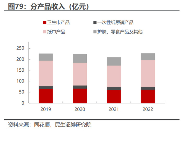 公司产品覆盖面广,高端产品蓬勃发展。公司产品包含纸巾、卫生巾、一次性 纸尿裤和护肤品、零食及其他,2022 年,公司纸巾/卫生巾/一次性纸尿裤/护肤品 及其他分别实现收入 122.48/61.56/12.02/30.09 亿元,纸巾产品占比 54.16%, 占据了公司收入的半壁江山。公司不断升级产品,2022 年“云感柔肤”系列高端 纸巾销售同增近 80%,占纸巾销售超过 10%,高端化进程持续推进。 电商及新零售渠道表现突出。公司积极顺应行业趋势,通过传统电商平台、抖 音销售产品,在电商领域持续发力,此外,公司积极把握社区团购和 O2O 平台, 22 年销售占比超 13%。2022 年,电商渠道销售占比 26.9%,相比于 2018 年增 加 12.5pct,未来仍有较大成长空间。