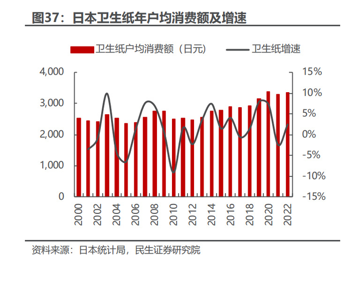 经济下行期间,日本户均生活用纸消费保持增长,而户均总消费下滑。2000- 2022 年,日本年户均生活用纸(面巾纸和卫生纸)消费依然呈增长趋势。年户均 卫生纸/面巾纸消费额从 2525/1902 日元提升至 3362/1960 日元,CAGR 为 1.31%/0.14%。同期日本年户均总消费从 337 万日元下降至 293 万日元,CAGR 为-0.64%。