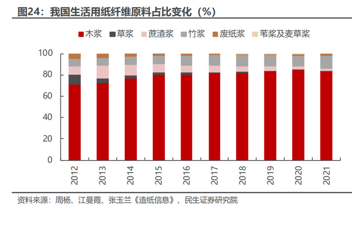 分原材料看,木浆占比持续提升。2022 年我国生活用纸纤维原料中木浆/草浆 /蔗渣浆/竹浆/废纸浆分别占比 83.3%/0.9%/2%/12.1%/1.7%,2012-2021 年占 比分别变动+12.1/-8.8/-5.6/+5.4/-3.1pct。相比其他浆,木浆纸色泽、起皱均匀, 柔韧性能好,有些甚至湿水不碎,且没有致病菌,而竹浆纸等非木浆纸的柔软度略 差,起皱明显。