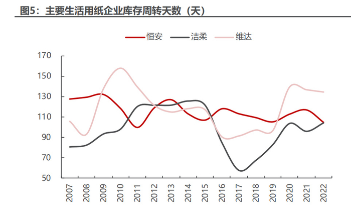 2018年浆价顶出现在2018Q2,针叶/阔叶浆均价分别为:904/811美元/吨; 中顺洁柔盈利拐点滞后浆价拐点 2 个季度至 2018Q4 季度,18Q4 公司毛利 率创阶段性新低至 31%,其后三个季度分别为 34%/39%/41%; 从节奏上看,生活纸企业毛利率拐点会滞后于纸浆价格拐点 3-4 个月,主要 受到库存影响,参考 2022 年报,恒安国际/维达国际/中顺洁柔存货周转天数分别 为 117/135/104 天,本轮针叶浆/阔叶浆于 3 月底陆续降价,我们预计生活纸企 业毛利率拐点或在 23Q3 后逐步显现。