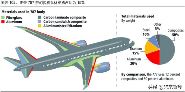 与军用战机类似,民用客机中钛材同样应用于机体以及航空发动机两大部位。虽然钛合金结 构占比整体低于军用战机,但由于空机质量大,单架客机钛材用量显著高于军用战机。波音 787 梦幻客机钛合金结构占比达 15%,机身钛合金用量约为 8.5 吨—10 吨。中国首款具有自 主知识产权的单通道涡扇喷气客机 C919,机翼机体上共有二十多个钛合金零部件包括锻件、 厚板、薄板、管材等,钛合金结构占比为 9.3%,用量约为 1.9 吨。