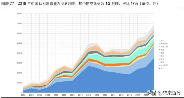 中国的国产大飞机 C919 正处于高强度试飞阶段,尚不具备量产的能力。自 2000 年以来, 钛材需求主要集中在中低端的石油化工领域,2016 年起中国“十三五”规划的制定以及国防 军队现代化的“三步走”战略的更新,航空航天领域用钛量不断提升。2019 年中国钛材总消 费量达 6.9 万吨,其中航空航天用钛量约为 1.2 万吨,占总消费量的 17%,近两年的 CA GR 达 10%。我们认为,虽然近年来中国航空航天、船舶制造、海洋工程等高端用钛占比持续优 化,但是与全球钛材需求结构相比,高端用钛占比依旧偏低,未来增量空间广阔。
