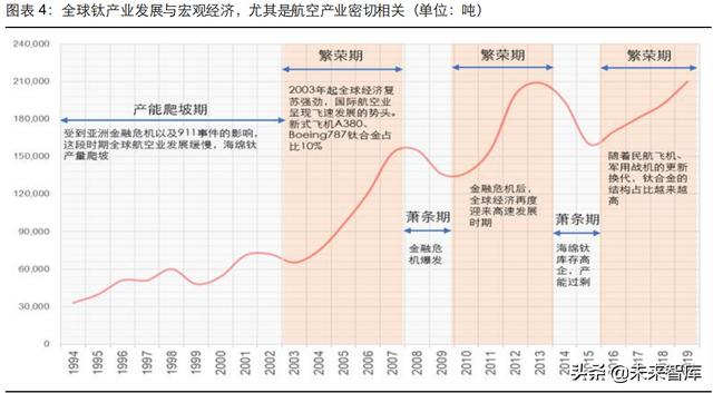 作为钛材的重要原料,海绵钛价格和产量一定程度上能反映出行业景气程度。从全球视角来 看,90%的钛材应用至航空航天和工业领域。钛产业发展与宏观经济,尤其是航空产业密切 相关。回顾历史,国际海绵钛的产能大约每经过 5-10 年就会经历一轮新周期,每轮周期的开 始总是伴随着全球经济复苏以及航空航天业发展。2020 年在新冠疫情冲击以及逆全球化趋 势的影响下,全球航空业遭受沉重打击。世界知名航空公司波音更是因为安全性问题,订单 数量急剧下滑,部分小型航空公司也在疫情期间入不敷出相继破产。以史为鉴,全球钛产业 极有可能处于短暂萧条期。