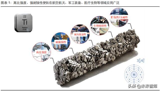 钛(Ti),元素周期表第四周期 IVB 族元素,是一种银白色过渡金属。优良物化性质使其被广 泛应用于航空航天(机身和发动机)、石油化工(冷凝器、换热管)、国防军工(导弹火箭) 以及医疗生物(人造骨头)等高端领域。钛物化性质中最为突出的特点包括: