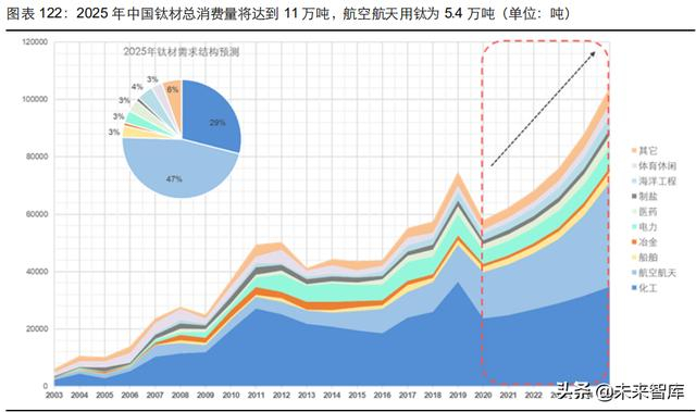 我们认为,2021 年—2025 年间军品钛材将成为中国钛材消费市场的“核心发动机”,需求增 速将呈加速增长。军品钛材增量主要来源于航空航天和船舶制造两大领域,我们预计 2025 年中国钛材总消费量将达到 11 万吨,其中航空航天用钛将达到 5.4 万吨,首次超越化工用 钛成为中国钛材第一大消费领域,CAGR 达 27%呈现加速增长。船舶用钛在国防军工装备加 速现代化的大背景下,将保持 15%的高增速。民品钛材受新冠疫情的冲击,传统用钛 2020 年预计大幅下降 40%,未来呈现逐步恢复的状态。