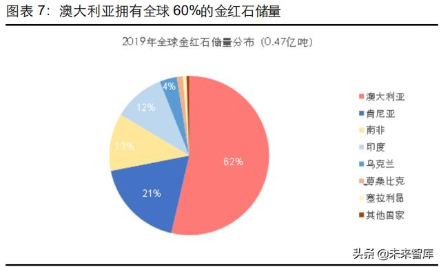 全球钛资源储量丰富,目前具有工业利用价值的钛矿资源主要以钛铁矿、金红石两种为主, 钛铁矿储量占比高达 95%。据 USGS 数据显示,2019 年全球钛矿总储量约为 8.2 亿吨,其 中钛铁矿 7.7 亿吨,金红石 0.5 亿吨。中国和澳大利亚,作为钛铁矿储量最大的两个国家, 分别拥有 2.3 亿吨和 2.5 亿吨的储量。金红石方面澳大利亚独占半壁江山,拥有 0.29 亿吨储 量。