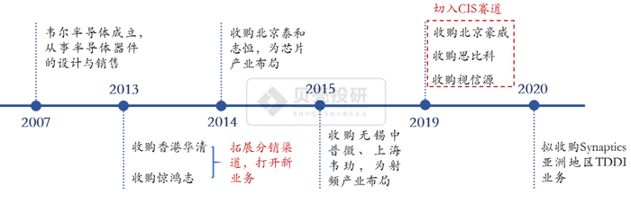 韦尔股份成功收购北京豪威、思比科、视信源,切入CIS黄金赛道。2019年8月,韦尔股份完成对北京豪威85.53%股权、思比科42.27%股权、视信源79.93%股权的收购。收购完成后,韦尔股份合计直接及间接持有北京豪威100%股权、思比科96.12%股权。