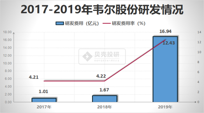 作为一家高新技术企业,韦尔股份极其重视自身研发能力的提升。2019年,韦尔股份半导体设计业务研发投入金额高达16.94亿元,研发费用率为12.43%。韦尔股份在稳步提升原有产品类型的研发投入基础上,持续加大在北京豪威及思比科专注设计研发的CMOS图像传感器芯片领域的研发投入。