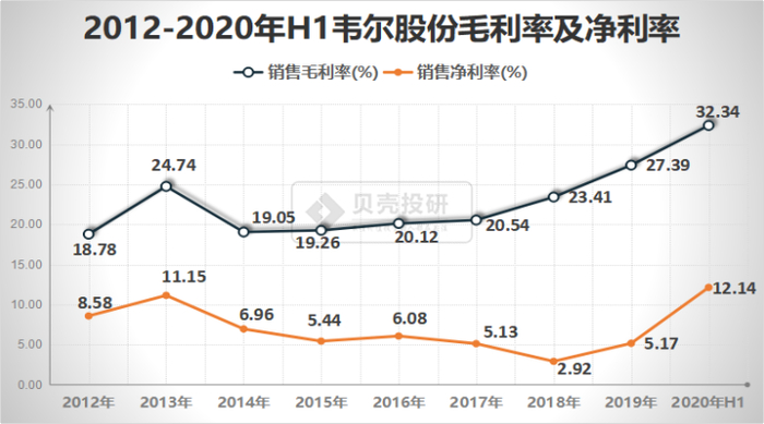 韦尔股份毛利率稳中有升,主要是豪威高端CIS毛利率较高。2018-2020年H1,韦尔股份毛利率分别为23.41%、27.39%和32.34%。2019年8月,韦尔股份完成收购,大幅提升半导体产品设计业务占比,综合毛利率得到显著提升。