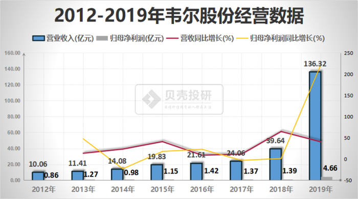 2019年,韦尔股份完成并表,营收、净利润大幅增长。2019年Q4,韦尔股份股票(603501)并表北京豪威、思比科,营业收入大幅增长至136.3亿元,归母净利润增长至4.66亿元。