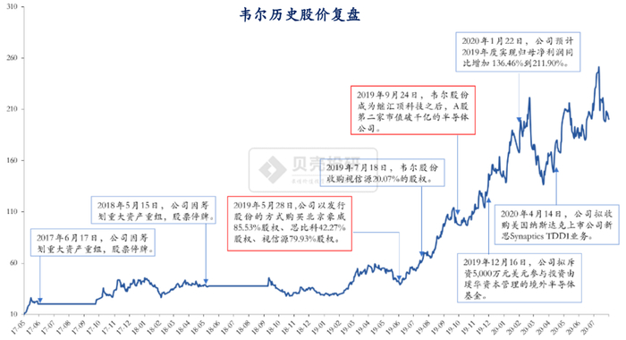韦尔股份自上市以来,受到资本市场青睐,股价呈现长期上涨趋势。韦尔股份抓住机遇,上市后规划重大规模资产重组,在CIS设计领域谋篇布局。成功切入CIS光学黄金赛道后,韦尔股份结合自身半导体分销优势,内伸外延,实现业绩的高增长。