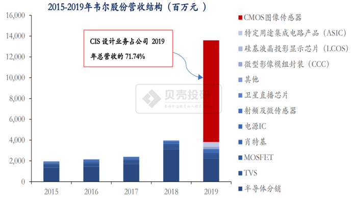 韦尔股份的主营业务分为半导体产品设计和半导体产品分销两部分。2019年,公司半导体设计业务收入占主营业务收入的比例提升至83.56%。目前,公司半导体设计业务主要分为两大产品体系,图像传感器和其他半导体器件。