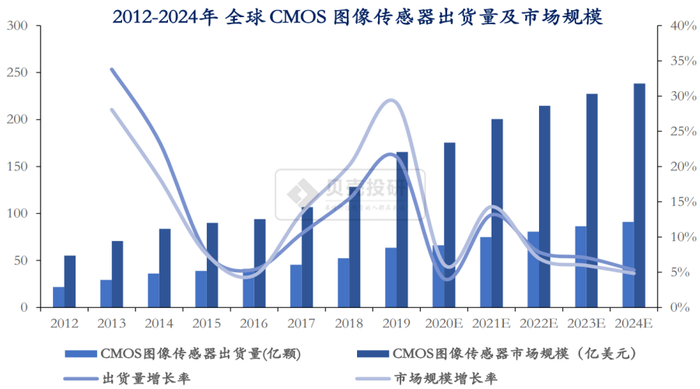 CIS处于高速发展阶段。2019年智能手机出货量增速放缓,但多摄及高清化的发展方向明确。预计未来全球CIS市场规模增长率仍将保持较高水平,2024年全球CIS出货量将达到91.1亿颗,市场规模将达到238.4亿美元。