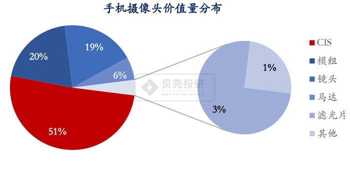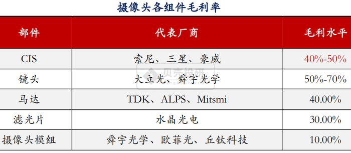 第二,CIS价值量高、毛利率高。手机各部件中,摄像头模组价值量逐年走高,例如华为发布的旗舰机P40 Pro+,摄像头模组成本或超100美金。摄像头模组中,CIS是最贵的零件,CIS芯片价值量占比达50%以上。