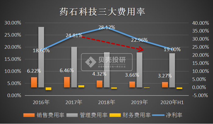 其次,药石科技销售人员及管理人员的效率也得到了明显的提升。一方面,药石科技自身的商业模式(2B)决定了企业较低的销售费用率,企业不需要花费较多的市场推广费,而随着公司营业收入的增长,公司销售费用率呈下滑趋势。与此同时,药石科技股票(300725)的管理费用率(含研发费用)也获得了同样的下滑。