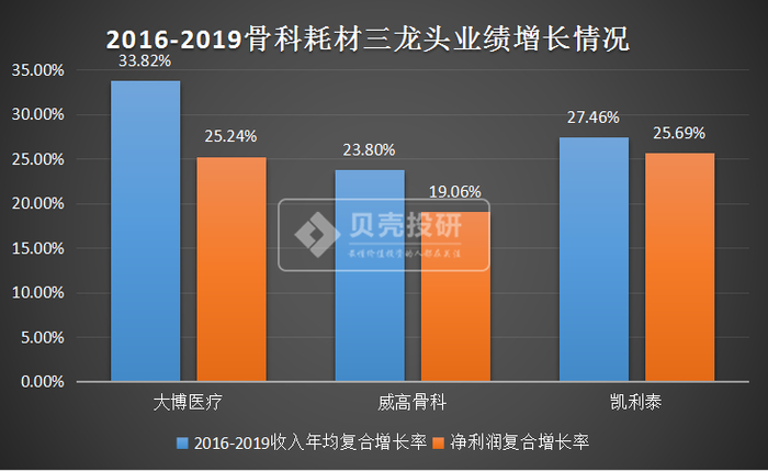 数据显示,2016-2019年间,国产骨科耗材三龙头业绩均维持了较高速增长,其中,受两票制影响,大博医疗股票(002901)维持了更高的收入增长,而净利润也相对维持在了较高的增长水平。