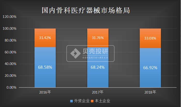 大博医疗龙头实力显著,未来面临着国产替代机遇。据统计,截至2018年,外资品牌仍然占据着我国骨科耗材市场重要市场份额,而我国骨科耗材龙头,威高骨科、大博医疗在市场中的份额不足5%。