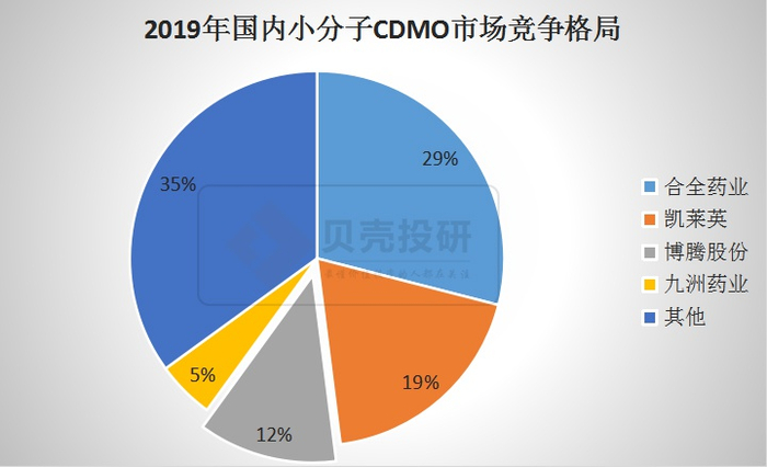从我国化学小分子CDMO竞争格局来看,一梯队企业主要有合全药业、凯莱英、博腾股份三家,按销售额统计,三者市场占有率分别为29%、19%、12%,占据了国内大半的市场份额。