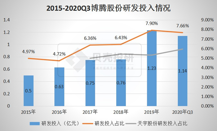 数据显示,2017年之后,其研发投入及研发投入占比均明显提升,高于传统原料药生产企业。截至2020年半年报,博腾股份研发人员数量占比达到20%,相比于2016年的整整增长了一倍。