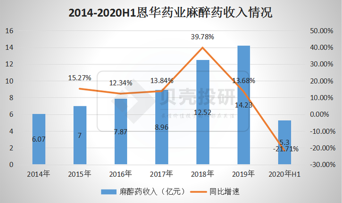 因此,恩华药业麻醉药收入规模不及同类竞争者恒瑞医药、人福医药等,截至2019年,三者的麻醉药收入分别为14.23亿元、55.07亿元、36亿元。
