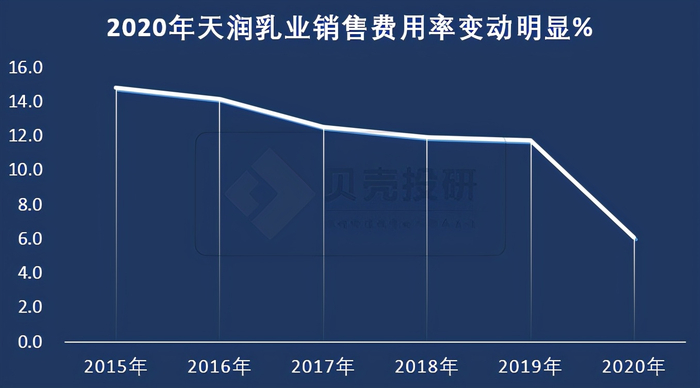 其实从财务的角度来看,最值得关注的是公司利润表中销售费用的变化。2020年天润的销售费用从2019年的1.9亿元降至1.08亿元,第一次出现了负增长。销售费用率从11.7%降低至6.1%接近“腰斩”。