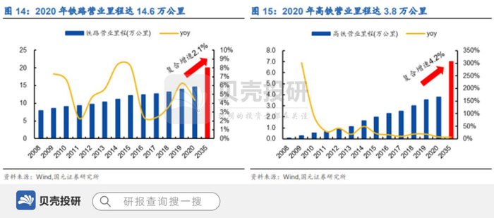 根据国铁集团披露的《新时代交通强国铁路先 行规划纲要》规划,到 2035 年,我国将建成全国铁路网 20 万公里左右,其中高铁 7 万公里左右,较 2020 年末分别新增 5.4 万、3.2 万公里。