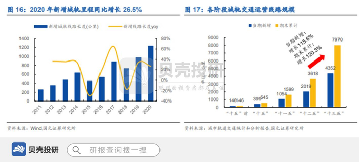 2019、2020 年均为城市轨道交通发展大年,2020 年城轨运营里程新增里程达 1233.5 公里,同比增长 26.5%。“十 三五”五年新增运营里程已超过“十三五”前期总和,城轨建设高速发展。2020 年新增城轨计划投资 4709.86 亿元,同比增长 37.5%,将持续支撑城轨建设高速发展。