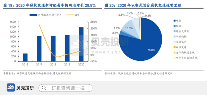 2020 年城轨交通新增配属车辆 1376 列,同比增长 28.8%,2020 年新增城轨计划投资 4709.86 亿元,同比增长 37.5%,为城轨交通市场持续提供增长动力。2020 年城轨交通运营里程中地铁占比达 78.8%,市域快轨占比达 10.3%,占比提升 3.2pcts。十四五规划提 出重点发展市域快轨促进多网融合,并持续推进智慧城轨建设,我们预计城轨交通将形成以市域快轨为重心的快速发展模式。