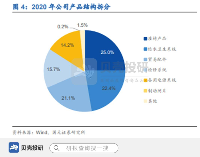 公司收入主要由座椅产品、给水卫生系统、贸易配件、检修系统、备用电源系统组成。2020 年座椅产品、给水卫生系统、贸易配件、检修系统、备用电源系统收入占比分别为 25%、22%、21%、16%、14%,各项业务对收入贡献较为均衡。