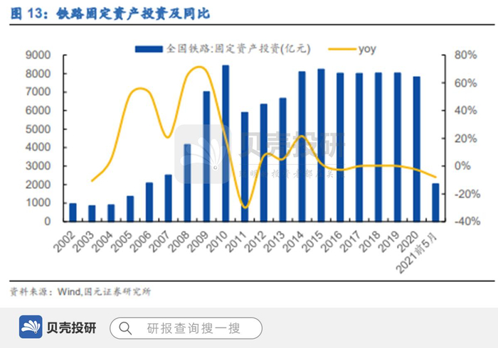 2020 年铁路固定资产投资额 7819 亿元,同比下降 2.6%,2021 年前五月为 2036 亿元,同比下降 8%,较 2020 年略有回落。自 2014 年以来铁路投资均在 8000 亿左右的水平,我们预计 2021 年全年铁路整体投资额仍将保持这个水平。