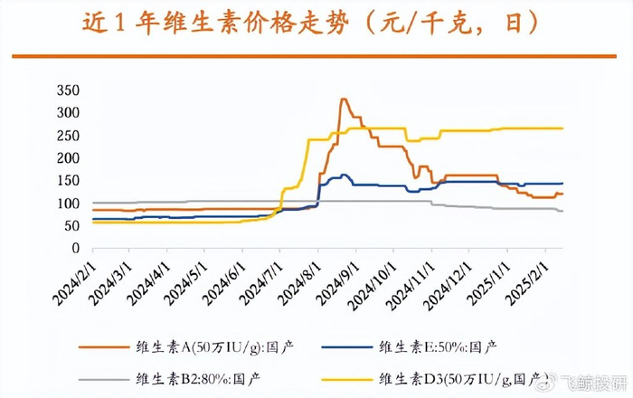 与此同时,2024年下半年国内多家厂商也集中进入停产检修期。多重因素的叠加影响下,全球维生素市场供不应求,维生素价格一路飙升。