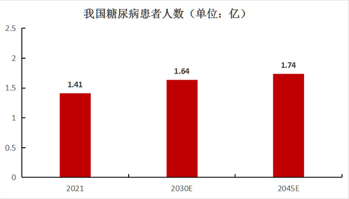 数据显示,2021年我国糖尿病患者约1.41亿,基数庞大,占全球患者总数超四分之一,患者数量居世界首位,并且预计到2045年这一数字将增长至1.74亿。
