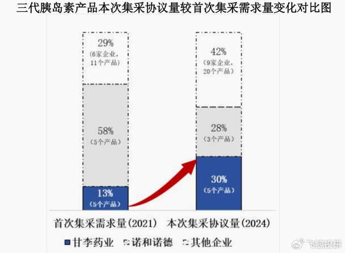 该轮集采中,公司获得三代胰岛素首年产品协议量4355万支,较上次集采协议量增长1156万支,占三代胰岛素产品总量的30%,市场份额大幅增加,已经超越诺和诺德,做到国内行业第一。