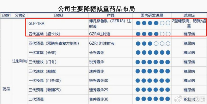 公司在研产品中,最具看点的便是博凡格鲁肽和GZR4注射液,这两款产品均聚焦于全球内分泌新药研发的热门方向,在临床研究中取得积极结果,有望成为同类最优药物。目前其相关适应症在国内均处于临床III期。