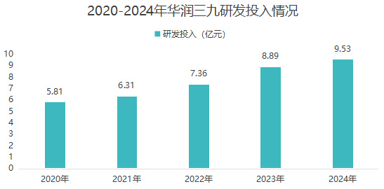 近年来,华润三九的研发投入从2020年的5.81亿元提升至2024年的9.53亿元。