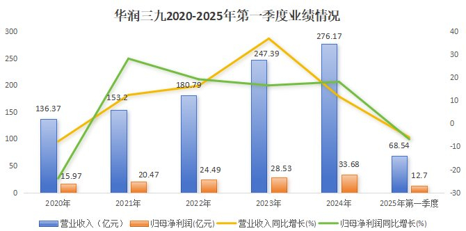 2025年第一季度,华润三九业绩就下滑了,公司实现营收68.54亿元,同比降低6.04%,实现净利润12.7亿元,同比减少6.87%。