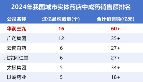 2024年,在我国城市实体药店中成药的销售额排名中,华润三九的999感冒灵超越东阿阿胶、片仔癀的产品,位居第一。