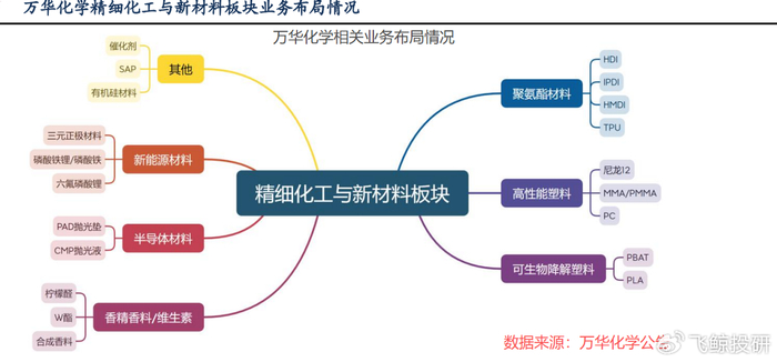 相比于石化业务,新材料业务则更像是万华化学的“新增长极”。当前,公司已在新能源材料、半导体材料、香精香料等多个领域布局,推动业务向高端化升级。