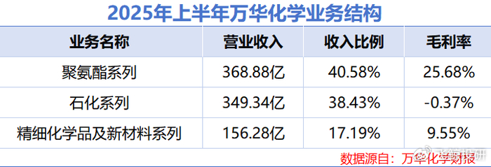 2025年上半年,聚氨酯主业毛利率达25.68%,而精细化学品及新材料毛利率仅为9.55%,石化业务更是出现-0.37%的负毛利率。