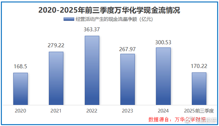 其二,即便处于行业调整期,万华化学仍有着较为稳健的造血能力。