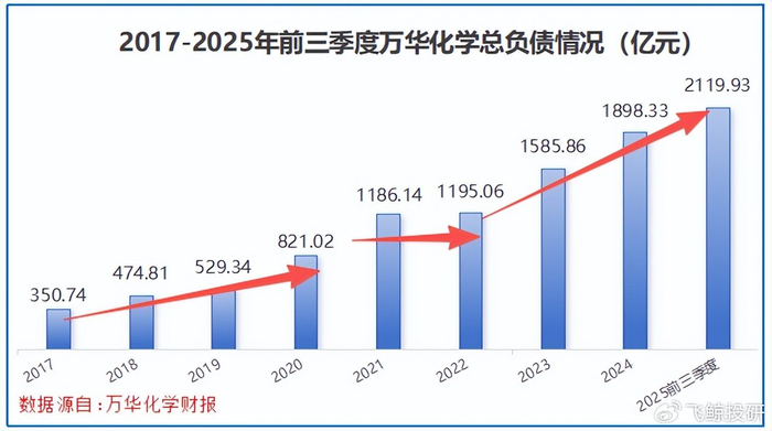 2017年至2025年三季度末,不到8年时间里,万华化学的总负债规模已从351亿元一路攀升至2120亿元,猛涨了5倍之多。